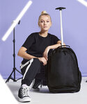 Retractable tow handle. Grab handle. Zippered front pocket. Internal compression straps. Side zippered pocket.