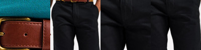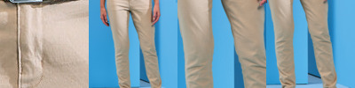 Flat front, straight leg, slim fit. 2 back pockets with button. Dyed to match buttons. Front side pockets. Dyed to match pocket bags. Belt loops.