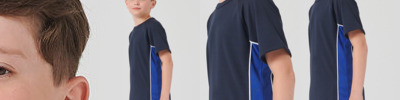Kids crew neck t-shirt with raglan sleeves. 100% Polyester Wicking Coolplus fabric. Contrast side panel and piping.